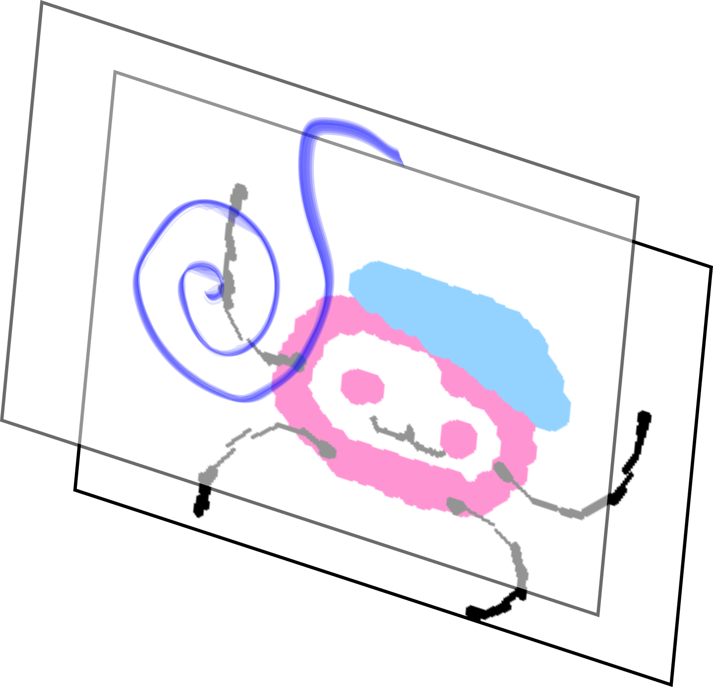 To tackle that problem, I devised a rather convoluted idea. I keep the GIF representation around and use two canvases. One canvas is in the background, showing the image; the other one is in the foreground and blank. Now when a user draws, they draw on the blank canvas instead of the image directly. Because I know which color table index they are using for drawing, I can then use the blank canvas to check which positions in the GIF representation need to be overwritten with a new index; after that, I simply update the image canvas and clear the blank one. This allows users to change which pixel is associated with which color table index, and it does not require any form of post-change color reduction.